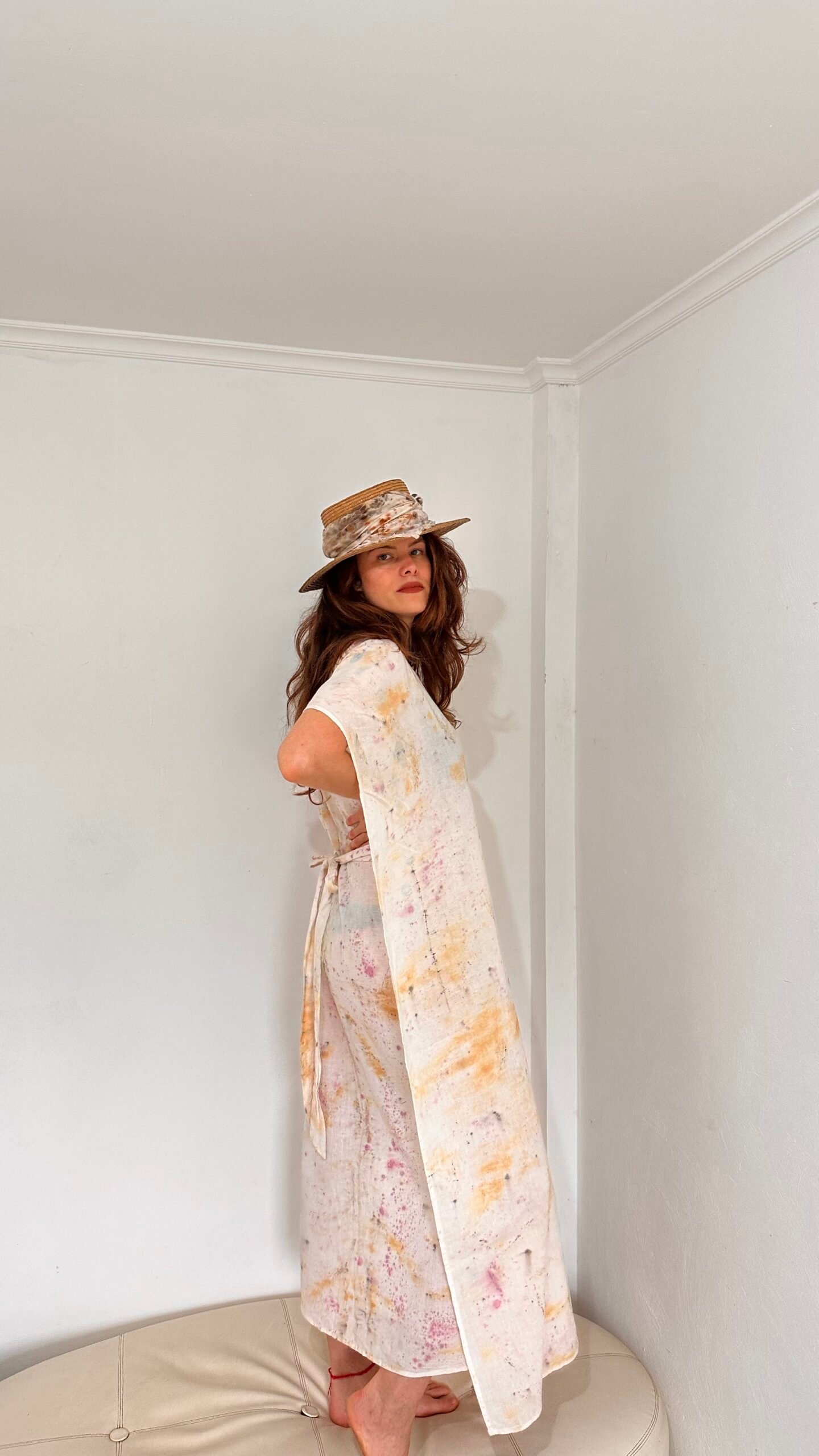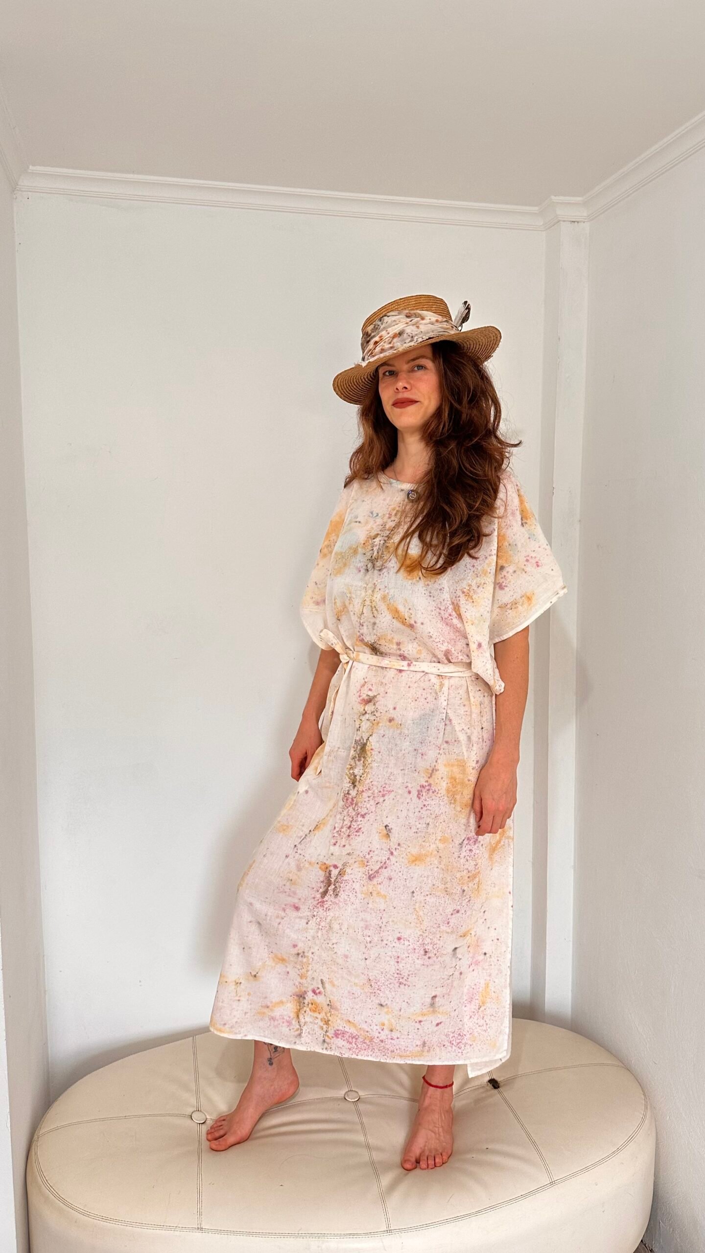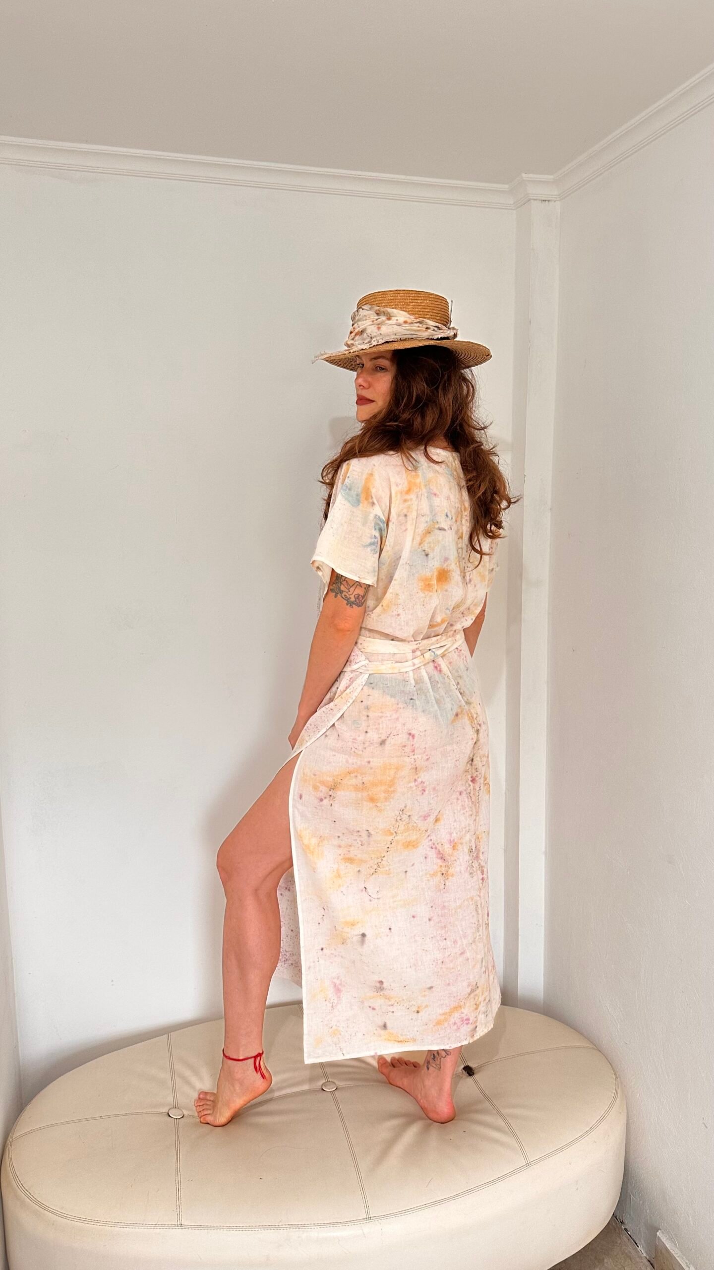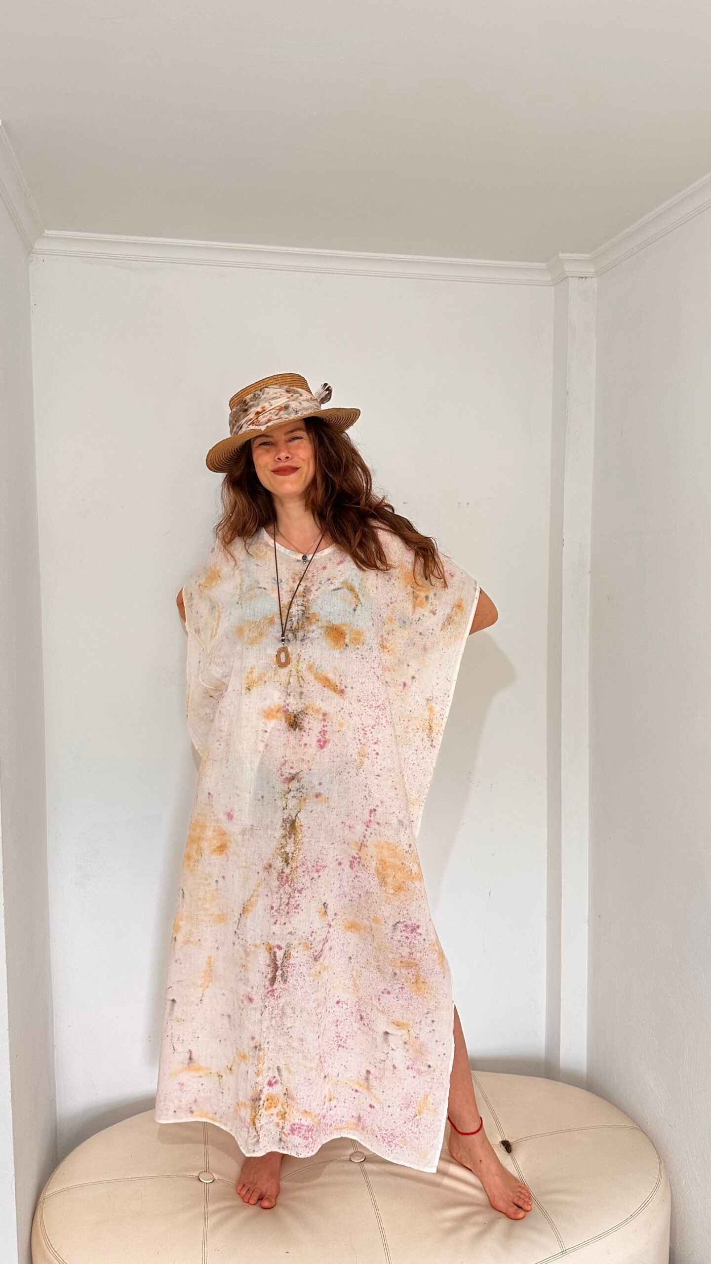 Maxi vestido de lino 100% estampado mediante procesos de impresión botánica con cochinilla, té y pino.