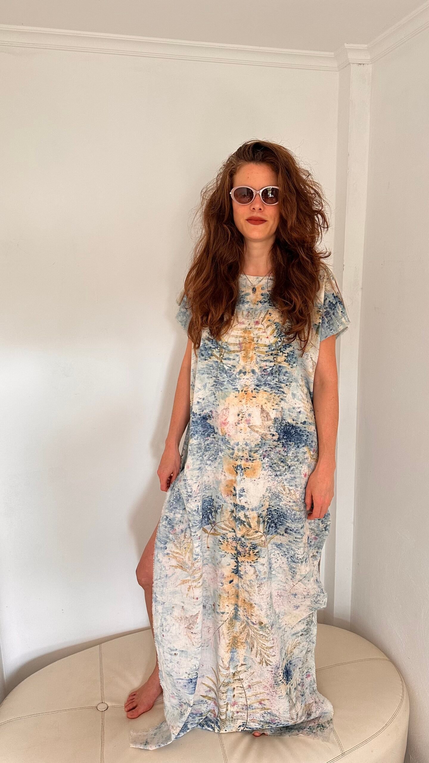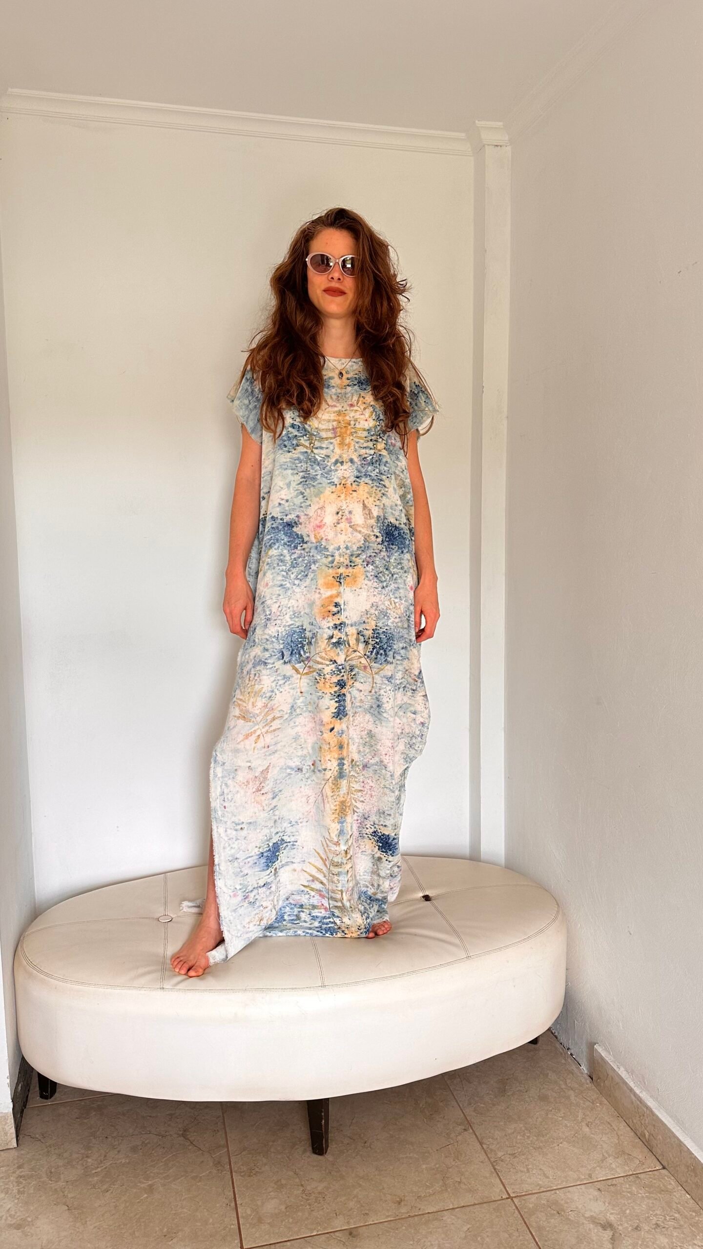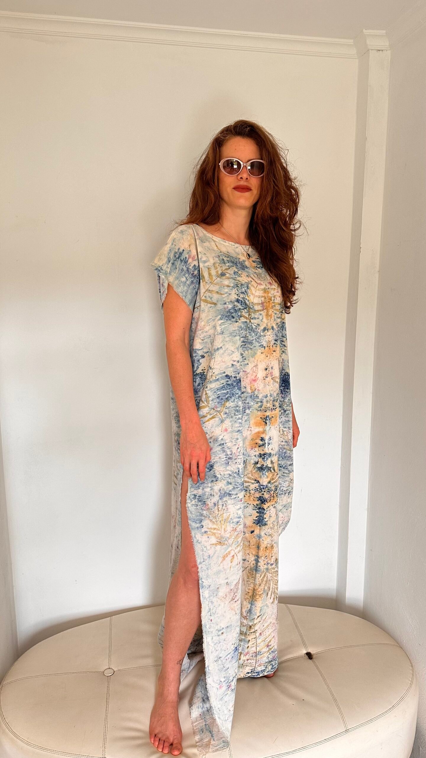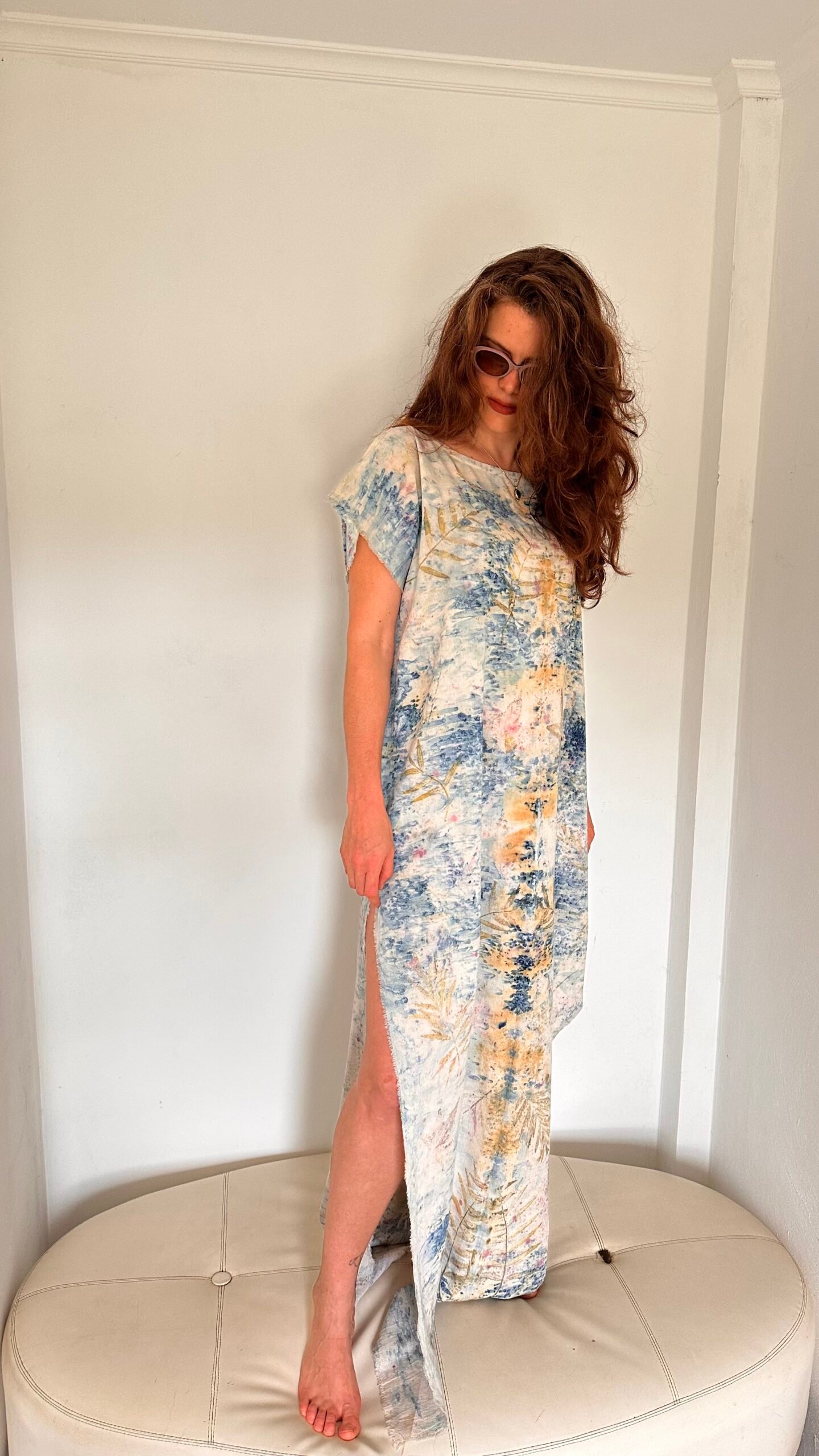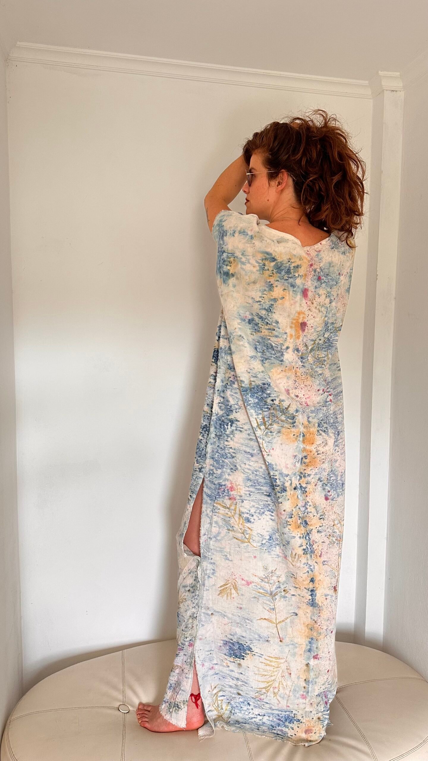 Vestido midi de algodón 100% estampado mediante procesos de impresión botánica con minerales, cochinilla y aguaribay.